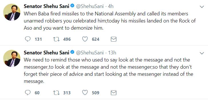 When Baba fired missiles to the National Assembly and called its members unarmed robbers you celebrated him; today his missiles landed on the Rock of Aso and you want to demonize him."