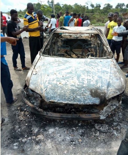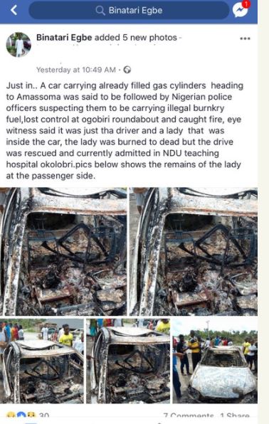 According to News Breaker, Binatari Egbe who shared the photos on his page the incident happened after police started chasing thinking that they were illegal bunkers, driving with overspeed the car exploded and got burnt beyond repairs.
